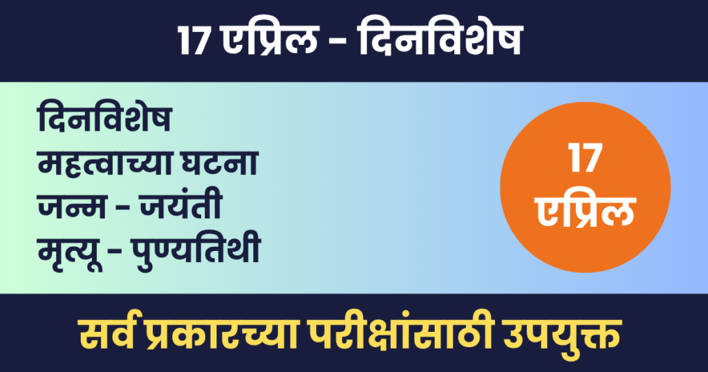 Dinvishesh17 एप्रिल दिनविशेष – महत्वाच्या घटना, जन्म आणि मृत्यू – 17 April Dinvishesh द्वारा Marathi Guruji Team | एप्रिल 16, 2026